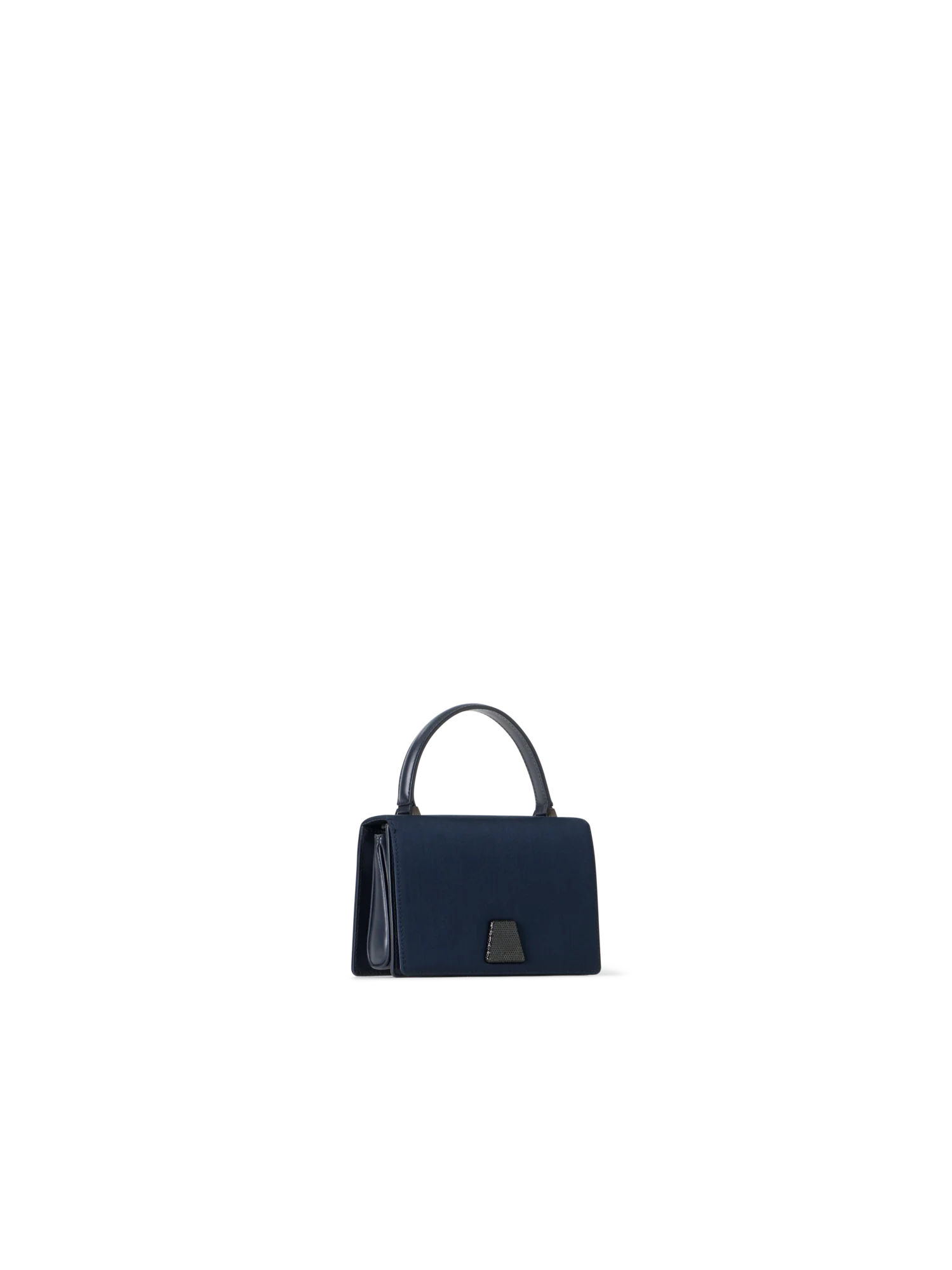 The Alice Mini Top Handle Bag embodies refined elegance. Crafted in satin with supple calf leather trim, it features the signature crystal-embellished trapezoid closure for a touch of glamour. A detachable chain strap allows versatile styling, while the spacious interior with zip pocket balances sophistication with everyday practicality.